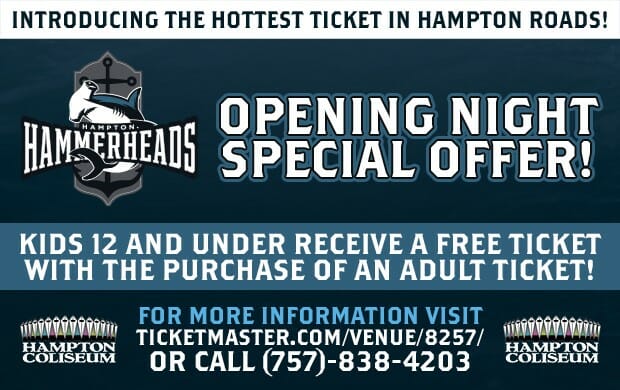 Lacrosse Fans there is a new team in town! Join the Hampton Hammerheads for their season-opening game at Hampton Coliseum and take advantage of their FREE Kids Ticket Offer (with purchase of an adult ticket)!